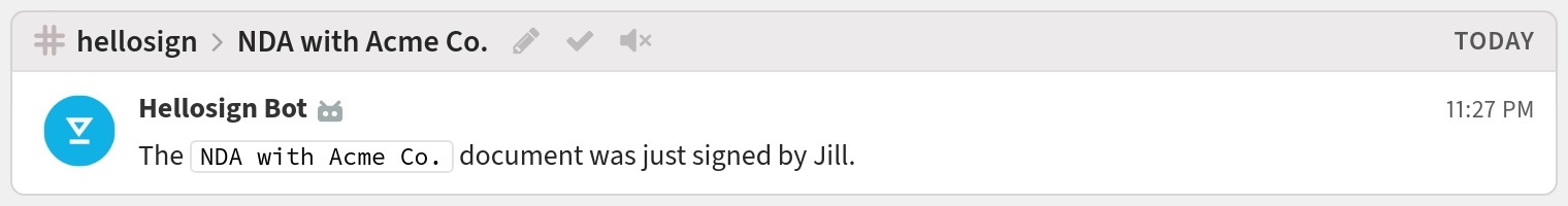 Create a bot for HelloSign. Make sure that you select Incoming webhook as the Bot type.